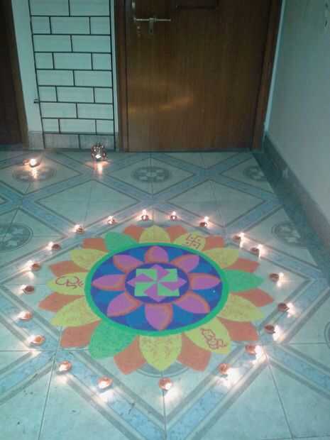 como la mayoría de ustedes chicos está celebrando el Halloween, en la India celebramos nuestro festival más esperado de Diwali. Como parte de la celebración, cada casa tiene un hermoso diseño frente a la puerta principal. Se llama como rangoli y hech