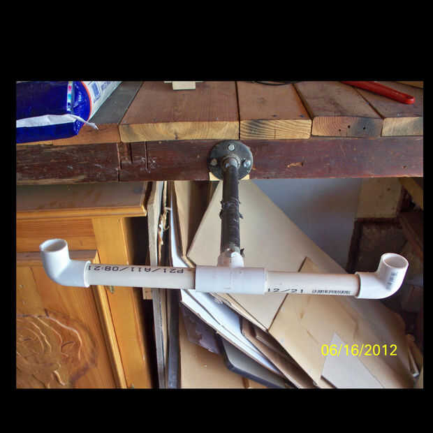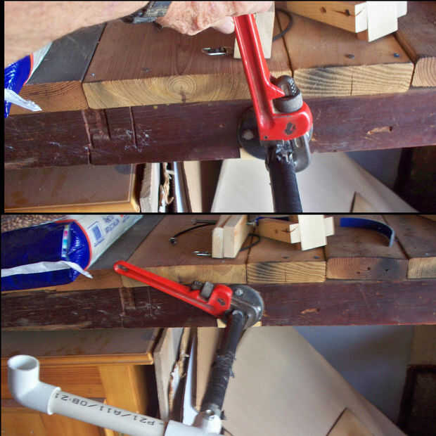Cemento utilizando PVC, soldar piezas juntos.  Tienen el pedazo perforado de madera en la mano para que usted puede comprobar la alineación de los agujeros a la madera.  Es fácil que se fuera en este paso, y si es así, la Junta no cabrá!  Utilizar una llave de tubo para que puedo hacer bicicleta soporte nivel y asegúrese de que el soporte no mueve una forma u otra.