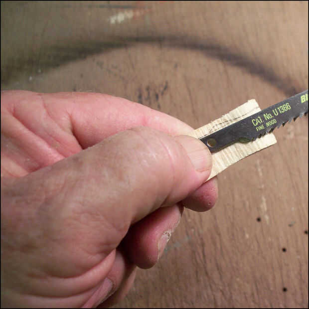 Queremos insertar la hoja en la madera, para que cuando las dos mitades se colocan juntos, ajuste apretado y puede ser pegados con pegamento de madera. Corte la madera dentro del contorno para aceptar la hoja.