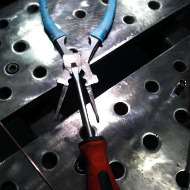 hacer un cuchillo de masilla Tecnología tienda DetroitSoldado con autógena un destornillador plano para un pequeño trozo de metal de hoja (era un raspador de juntas) y otras TIG soldado con autógena una hoja más grande para hacer un robusto cuchillo