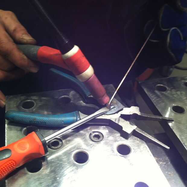 hacer un cuchillo de masilla Tecnología tienda DetroitSoldado con autógena un destornillador plano para un pequeño trozo de metal de hoja (era un raspador de juntas) y otras TIG soldado con autógena una hoja más grande para hacer un robusto cuchillo