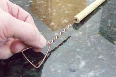 taladré un agujero en el centro del extremo de un pasador para hacer un soporte para el alambre torcido. La espiga es cerca de 1/2 pulgada de diámetro. Limpié un poco el alambre. Use un cepillo de alambre fino o lana de acero. Encajar los extremos de alambre torcido en el agujero. Debe existir un ajuste exacto.