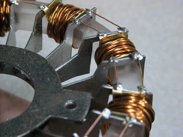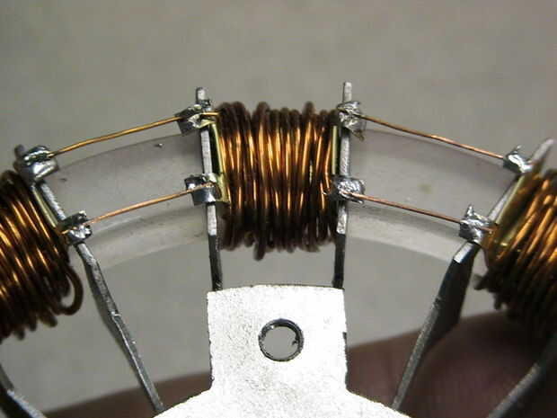 Ahora tienes que hacer 10 poco latón ficha cositas. Estos se sientan en la parte superior del anillo claro después de que se ha colocado en el armazón de la araña y luego luego se envuelven con el alambre de cobre de 22ga. Asegúrese de que cuando Envuelva el alambre no sobresalen demasiado lejos fuera de la araña marco armas-Asegúrese de que comprobar que el ajuste con la placa de montaje-mina es sólo una ligera fricción ajuste. Las cositas de ficha de latón deben ser sobre el mismo ancho que su anillo claro y las cuatro pestañas poco deben sólo sobresalen los bordes de los brazos de la araña. El último bit es soldar algunos cables de cobre corto 24ga a las pestañas.