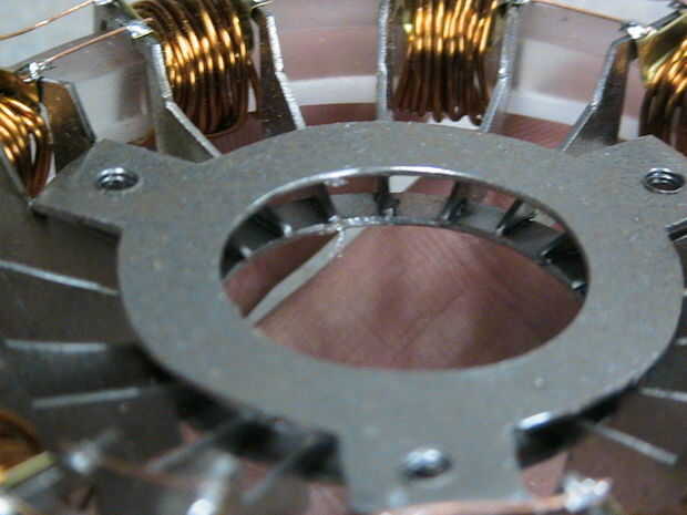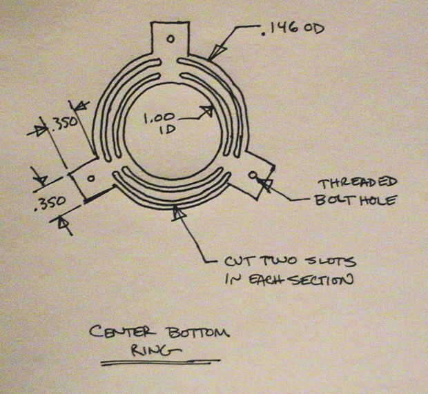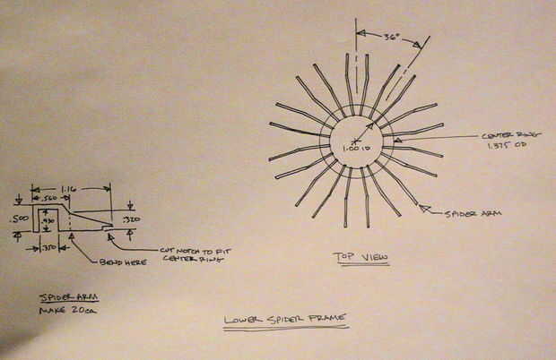Corté el anillo central y la araña brazos de Sierra de 22 ga chapa con Cizallas de chapa y un joyero. Una herramienta dremel también trabajaría y vendrá en práctico limpiar las asperezas. Los brazos acabados entonces eran soldados al anillo central. Entonces el anillo de fondo central fue cortado de la hoja de acero y había soldada al ensamblaje del marco de araña-nota cómo se posiciona. Estaba corto de tiempo así que salí hacia fuera de las ranuras adicionales. Los agujeros de perno se rosca para tornillos de 3mm.