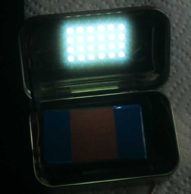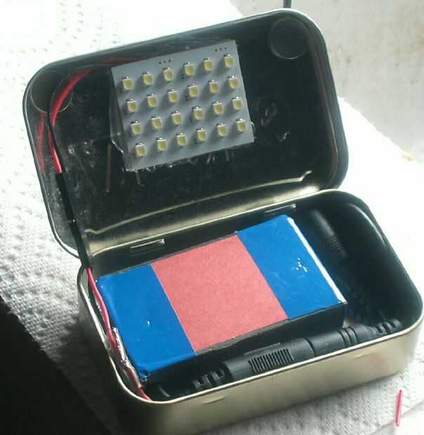El paquete de baterías tiene un interruptor de 2 hilos que salen de él, uno con un conector macho [power out] y otro con un conector hembra [de carga], coloque la batería en la bandeja, el panel de luz vendrá con algunos adaptadores, un extremo de un adaptador tendrá un enchufe y el otro extremo tendrá una toma de luz de algún tipo , cortar los cables cerca de la toma de tirar la toma, tira de los cables, corte 2 piezas de tubo del encogimiento del cerca de 1" de largo y deslizarlas en los cables, llevará conector hembra y tira de los cables y trence los cables [rojo con rojo y negro con negro], soldar los cables, deslice el tubo del encogimiento sobre las conexiones y calentar con un encendedor para sellar las conexiones , conecte el enchufe del adaptador y enchufe en el hombre de la batería en el conector hembra que acaba de hacer, encienda el interruptor para prueba, apague el interruptor cuando no esté en uso o cuando está cerrado, para recargar en el enchufe de la batería el cargador en un tomacorriente de CA y enchufe el conector hembra de la batería en el conector macho del cargador , las luces del cargador se dirá cuando está cargada, pegue los 2 imanes en la parte superior interior de la tapa de la lata, ayudan a mantener la tapa cerrada.