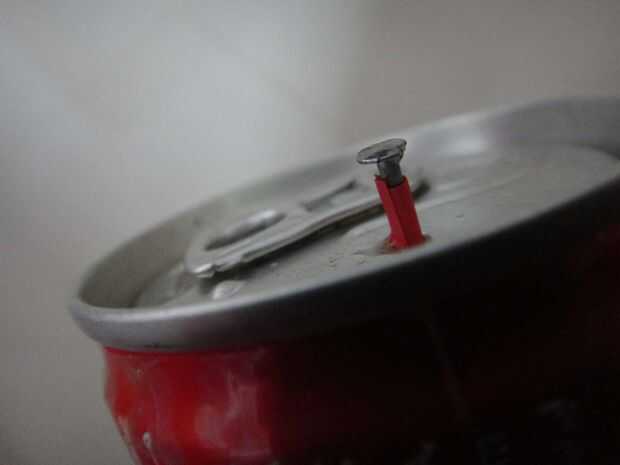 ahora es tomar la cinta de uñas e inserta a través del orificio en la lata para que la ONU grabó parte de la uña en la soda o apenas tocando la soda y la parte grabada está conectado o equipado con el poder.