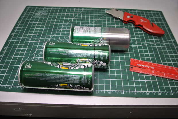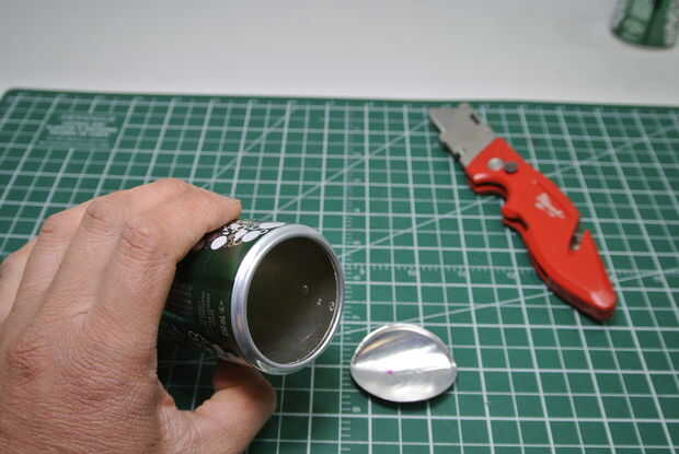 Tome una navaja filosa y cortar la parte inferior de las dos latas que aún tienen pintura en ellos. Marcar alrededor de la costura cóncavo inferior. Ir poco a poco, que no quiere cortar todo el camino, sólo profundamente bastante para hacer el aluminio más fino en la costura. Una vez que un profundo cuenta en la costura, empuje la parte inferior de la lata, debe saltar derecha.