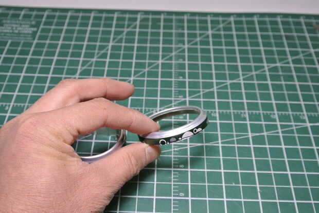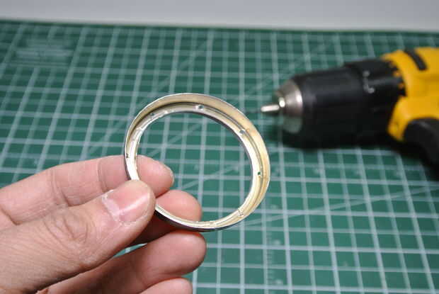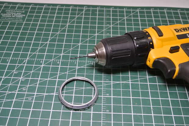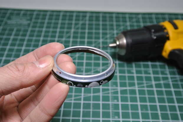 A continuación tome la lata con la marca de 8mm y corte hacia fuera, usted se quedará con un pequeño anillo. Usando un 1/32" o .7mm o .8mm Taladro broca ocho perforaciones alrededor del anillo. Puede que necesite experimentar con pequeñas o grandes brocas dependiendo de las latas utilizar. Este es el anillo del quemador.
