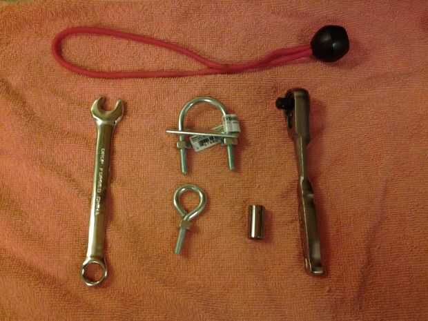 Instale el perno de ojo insertándolo en uno de los orificios del soporte. Utilice los alicates y llave de 7/16" y apriete el perno y la tuerca hasta que se mueve no más libremente.