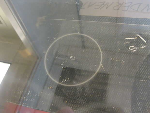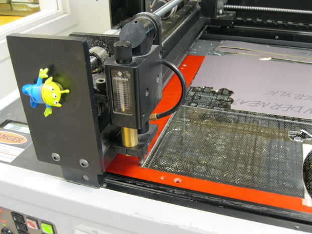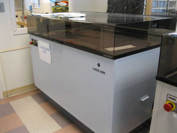 Actualmente tengo acceso a un modelo LaserCAMM no. 2305. Utiliza un láser de CO2 y puede cortar o marcar materiales tales como papel, acrílico, balsa etc.. El láser puede ser enfocado manualmente arriba una abajo por el tornillo de ajuste. Sólo lee archivos .dxf de AutoCAD 2000 en pulgadas. Disculpas si las fotos son borrosas; tienen que ser tirado a través de la cubierta protectora.
