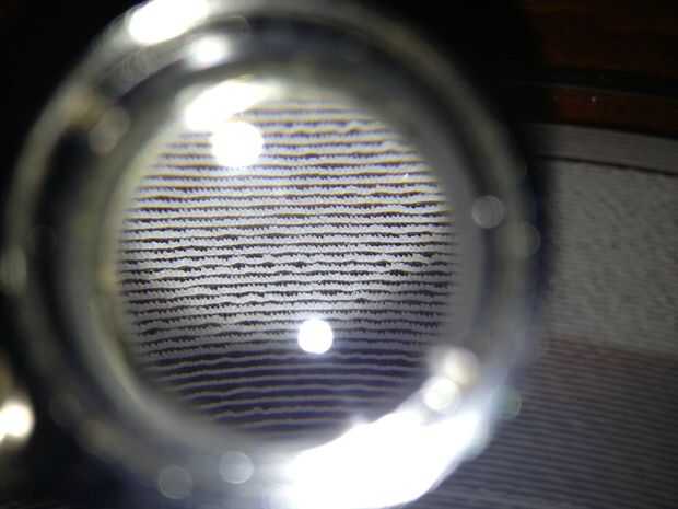Se trata de la aguja stock que viene con el tocadiscos. Saltar un poco antes de que el exceso de polvo acrílico se limpia hacia fuera. Parece haber un montón de ruido de fondo de alta frecuencia probablemente debido a las "protuberancias" en la figura 3. En este primer plano de la parte inferior de las ranuras es un patrón de diente de sierra visible debido a la pulsación de láser mientras se mueve de un punto a otro. Estoy tratando de reducir al mínimo esto, usted todavía puede escucharles a ellos, pero la aguja más pequeña probablemente es hundirse en el fondo de la ranura y recoger las protuberancias como ruido. El ruido también puede ser exacerbado en parte debido a que estoy usando un punto y disparar con el micrófono incorporado a la película esto.