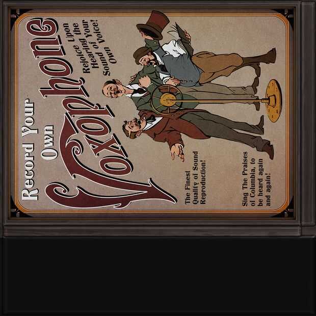 No he podido encontrar la textura en los archivos del juego, extraños ya que hay un montón de activos en desuso como la Elizabeth Gibson Girl y un dispositivo de la resurrección. Me encantaría acceder a este archivo de textura para confirmar los detalles. Además, la discográfica parece ser algo diferente de la etiqueta del Berliner, pero los detalles son demasiado vagos para hacer. Sólo puedo ver "Melodías mágicas" mientras que la etiqueta de Berliner "Melodías mágicas de Albert Fink".