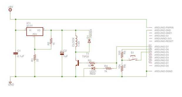 El transistor de conmutación es conducido a través de uno de los pines de salida del Arduino. Puse un LED en paralelo para ayudar con la depuración (por lo que puedo probar el programa sin tener el reloj de cableado). Finalmente yo con cable un interruptor a uno de Arduino de otros pernos. La intención era usar este para entrar en un modo de configuración (por ejemplo, configurar la configuración de red inalámbrica) sin embargo nunca se hizo uso de ello.