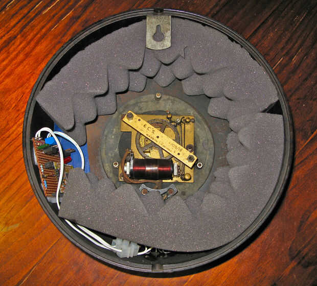 Un último cambio que hice fue agregar algunas goma espuma dentro del cuerpo del reloj para ayudar a hacer el 'clic' ruidoso cada 30 segundos. Simplemente es sostenido en lugar por su forma.
