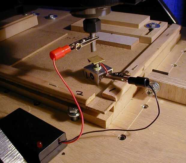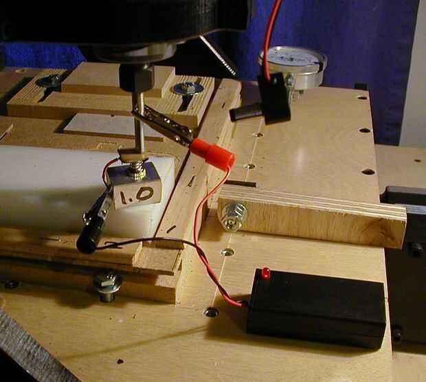 Para ajustar altura de la herramienta en tu router/molino CNC, puede hacer fácilmente un resorte cargado touch placa basada en un mecanismo de interruptor momentáneo "mini" que proporciona la acción del resorte es necesario. En lugar de utilizar la técnica estándar de 'calibre bloque y papel' que implica ensayos repetitivos, el bloque de contacto le permitirá programar rápidamente una herramienta de corte en una distancia exacta de la superficie de la mesa de trabajo. Un probador de continuidad básica de una batería y un LED proporciona una indicación visual cuando el bloque en contacto con la herramienta.