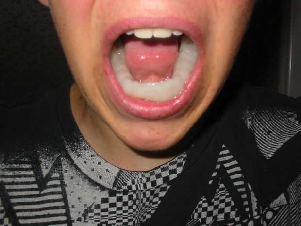 Una vez hecho esto, suavizar otra vez poniendo en el agua, inmediatamente lo saque y lleva a la boca, sobre tus dientes (superior o inferior). Intentar crear succión con su boca para conseguir el retén para ajustarse perfectamente sobre los dientes. Use sus dedos para presionar el plástico alrededor de los dientes también. Si este es su segundo retención que usted está haciendo, mordida hacia abajo para que el otro retén hace una impresión en el actual. Esto asegurará que encajan entre sí.