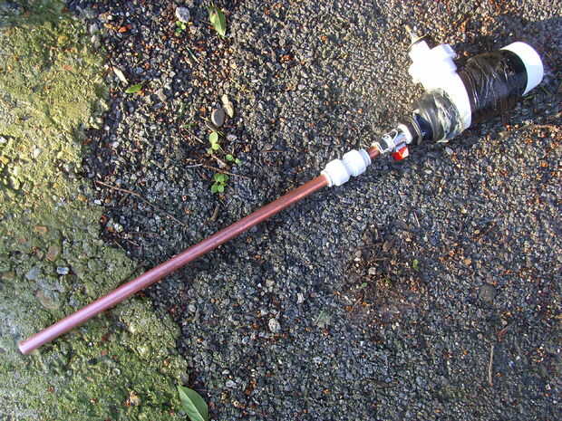 Esta pistola dispara bolitas de patatas y es más o menos exacta a 30 metros. Tiene una cámara de presión una trampa de botella tubería de desechos domésticos y se llena mediante una válvula de una llanta de bicicleta. Tiene un gatillo de una válvula de parada de máquina de lavar y un barril de tubería de cobre de 15mm. Se ha puesto junto con las conexiones de plomería estándar y reforzado con una cantidad abundante de pegamento caliente y cinta.