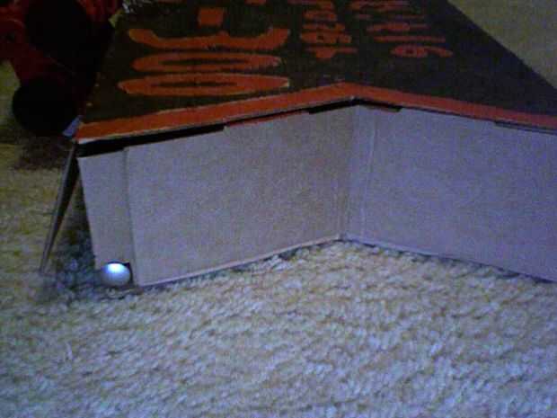 Coge su caja de tapa abierta, y realizar un corte en forma de v en la parte posterior. Asegúrese de que todavía puede voltear la parte superior abierta. Una vez que lo ha hecho, tapar con la cartulina. También, hacer un poco cortada en la parte posterior para el láser para que deslice suavemente. NO cortarlo totalmente, pero en cambio, la doble. Esto le dará resistencia para su láser para que no pueda deslizarse alrededor mientras lo usa.