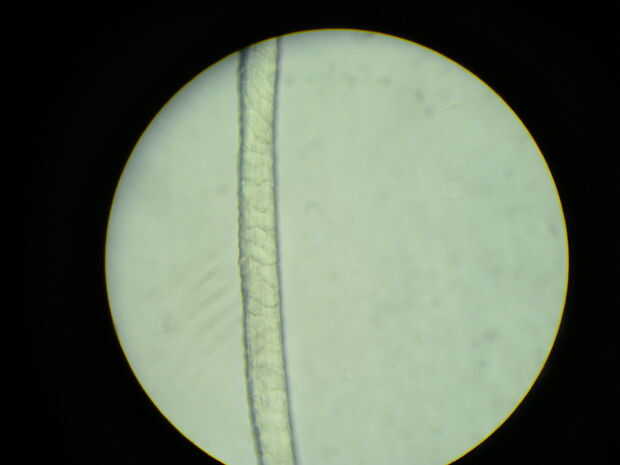 La foto del microscopio es de una fibra de lana solo. Quería que seas capaz de ver lo que está sucediendo cuando usted dunk esa lana en el agua jabonosa caliente. ¿Ver las escalas en la fibra? Son la cutícula de la fibra. El cabello también tiene una cutícula, actúa como tejas en un techo, protege el cabello o en este caso, la lana de las ovejas. Cuando se pone la fibra en el agua jabonosa caliente, la cutícula escamas abren y agarrar a uno con el otro, y como que cool, cerrar, apretar el lazo. Haciendo esto varias veces, junto con agitiation que rompe las fibras, es lo que crea sentido.