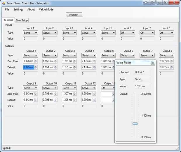 Para utilizar la bodega valor selector hacia abajo de la tecla CTRL y haga clic en uno de los cuadros de valor numérico. Si usted se hace clic en un canal de salida se activará el control deslizante. Desplace el cursor hacia arriba y hacia abajo el servo se moverá a esa posición.