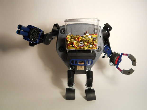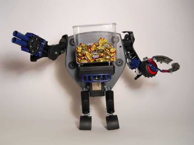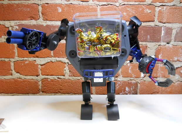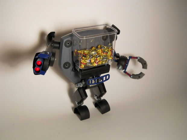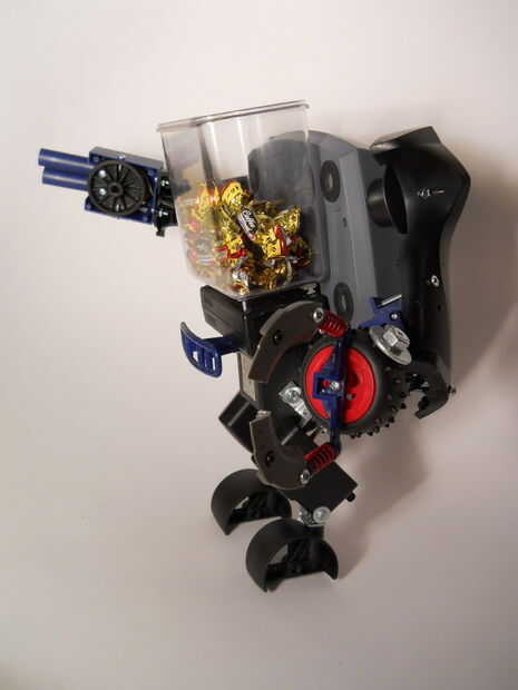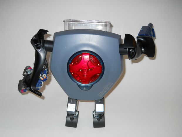 Así que tengo un joystick de PC dañado, un auto de juguete roto, algunos cargadores de teléfono móvil y un recipiente de plástico, y he hecho un tazón de fuente del caramelo de Robot. Funciona con un sensor de presión. Cuando alguien quiere tomar un caramelo, si toca el recipiente, RoboCandy despierta, gira su garra y las luces de su haz.