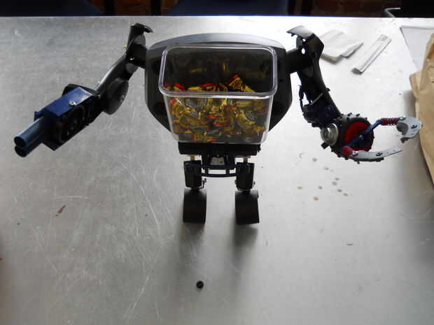 Suavemente, llene la mitad del recipiente con caramelos. Coloque el robot sobre la mesa y... sólo esperar!