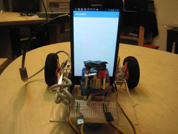 El MouseBot es un robot pequeño arduino wireless que se puede controlar con un ordenador. No requiere un módulo Wi-Fi. En su lugar utiliza un teléfono con android para conectarse a internet. El teléfono android también proporciona al operador con un vídeo de la alimentación desde el punto de vista de robots.