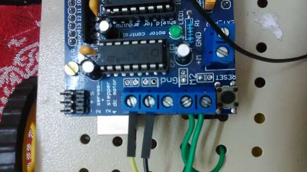 Tome un destornillador y gire los tornillos de los bloques de terminales hacia la izquierda (para abrirlos). Hacer suficiente espacio para los cables del motor se deslice en. Uno de los motores de BO y poner sus cables en los dos bloques de terminales en el canal de M1. Luego tomar el otro motor y poner sus cables en el canal M2 de la pantalla. Dejar la tierra como no es necesario ahora mismo.