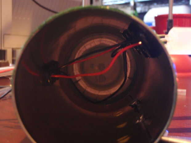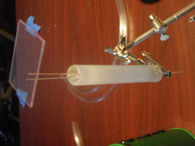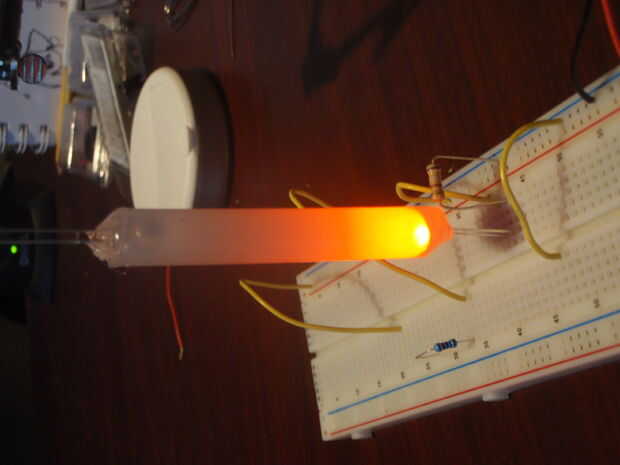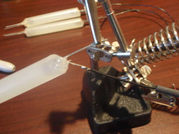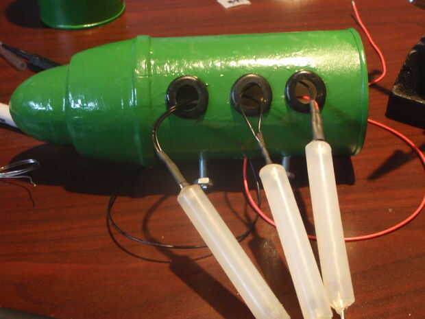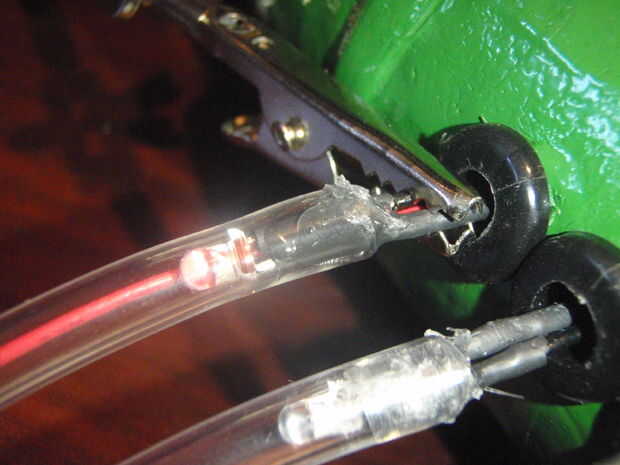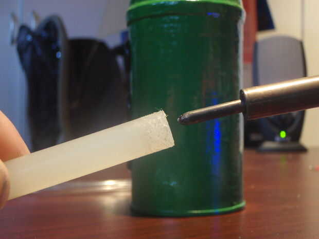 1. entre los paquetes del dos cohete tengo tres palillos del pegamento. Quería un lado iluminado con LED azul y el otro con naranja/ámbar LED. Agarra un palo de pegamento y el soldador, tener el soldador caliente y empuje en el extremo de la barra un agujero de fusión. Fundir un agujero de aproximadamente 1/4 - 1/2 inche, agarra un LED y empuje en el agujero mientras el pegamento está todavía caliente y flexible. Cuando empujas el LED en el agujero el pegamento rodean el LED y séllalo en.