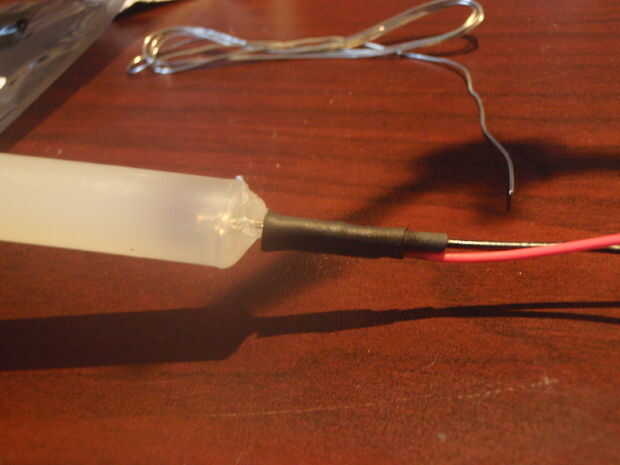 2. ahora nos suelde los cables de los LED que lleva. Comenzar con unas 4 pulgadas de los cables negros para los cables negativo y el metal expuesto con el calor del encogimiento del sello de soldadura. En uno de los cables negativo en uno de los LED azul, deja aproximadamente un pie de cable negro de allí (que será el principal cable negativo que pasará por los robots hacia atrás y en el pecho). En un LED azul diferentes, soldar un cable rojo para el positivo y deja sobre un pie. Este será el cable principal positivo para el lado azul.