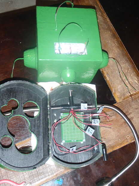 2. montar la cabeza. Coge la cabeza y deslice el cuello en su lugar, recordar el gromet. Para el cableado que sean utilizables de la cabeza necesitamos perforar un orificio en el "T articulación" (echar un vistazo a donde los cables salen de la articulación en la imagen siguiente). Tire de los cables por el agujero y aplasta el "T articulación" en el cuello