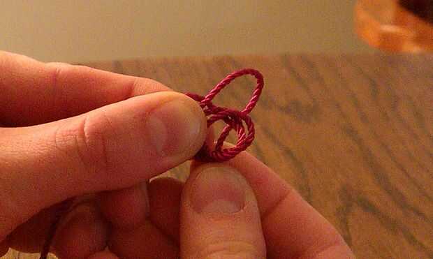 Deslice los lazos de los dedos, teniendo cuidado de no enredarlos.  Tome el extremo que se usó para envolver alrededor del dedo y pasarlo a través de los lazos, de atrás hacia delante.