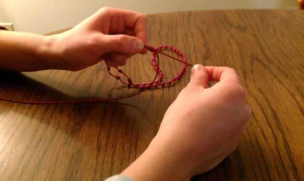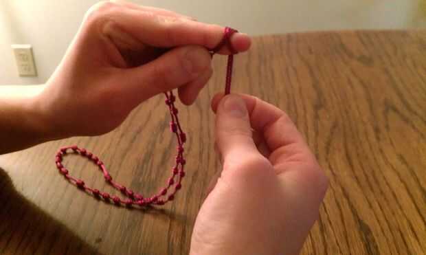 Ahora es cuando comenzará el Rosario como un collar.  Para atar el nudo del centro de Rosario, tome ambos extremos del hilo y ponerlos juntos, manteniéndolos cerca de los últimos nudos en cada extremo.  Un nudo de la misma manera que los nudos anteriores fueron atados, pero esta vez Utilice ambos extremos del hilo a la vez.  Cuando termines atar este nudo, el Rosario debe ahora ser un lazo, conectado en el nudo de centro que sólo atado, con dos hebras de ese nudo.