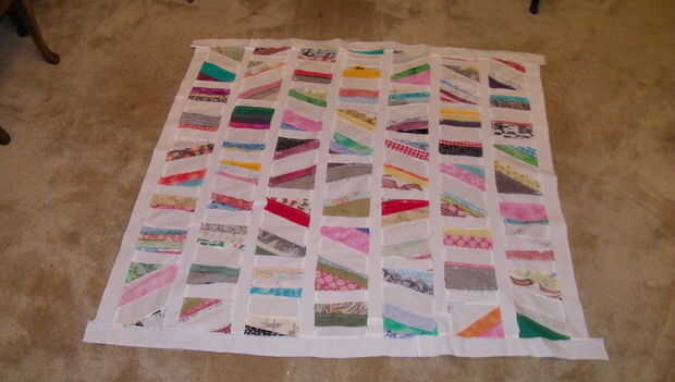 Sí, usted será finalmente recorte todo este... Ahora no... Sí. Parece un desperdicio. Sin embargo, hay menos residuos que volver a hacer el quilt entero. Y. Puede utilizar todas las guarniciones de tela bonita para hacer una cadena de tejido como el de fotos. Más sobre recorte y restos de bateo más adelante.