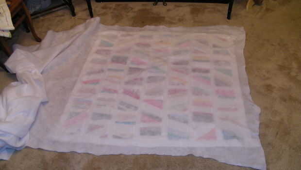 Colocar todo en su piso limpio y seco. Poner la colcha de arriba hacia abajo primero. Asegúrese de que el lado bueno de la débil se enfrenta a la planta. Desea que todos los hilos para terminar en el interior de su emparedado y costuras encantador. Ponga la guata en la parte superior. Asegúrese de que el bateo cubre completamente la parte superior con espacio de sobra (al menos 2 pulgadas todo el camino alrededor. Esto es importante ya que su sándwich va a deslizarse alrededor de un poco como pones cosas juntos y desea asegurarse de que no hay mantequilla de cacahuete hasta el borde.