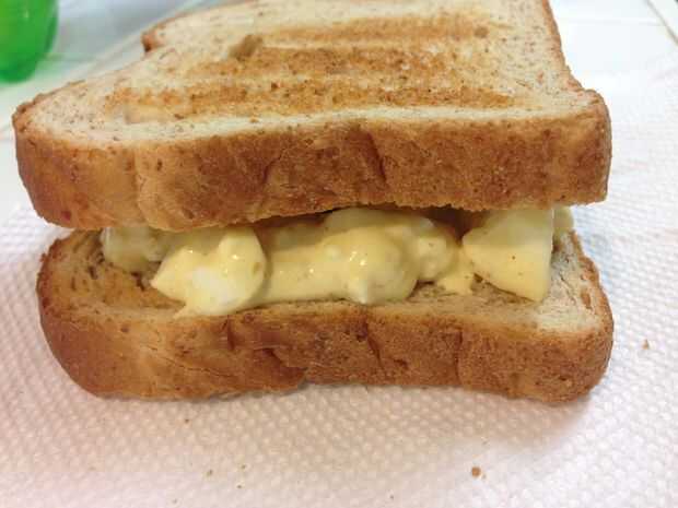 14. después de que el pan se tuesta, utilizar la cuchara mezcladora o el cuchillo de corte para la ensalada de huevo en una de las rebanadas de pan tostado. Coloque la otra rebanada encima de la rebanada de pan tostado cubierto de ensalada de huevo.