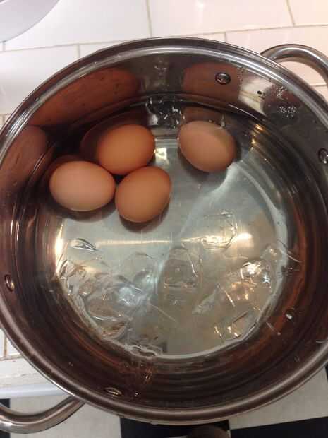 6. volver a llenar la olla con agua fría y añadir cubitos de hielo opcional en el agua. Mantenga los huevos sumergidos en el agua fría durante 5 minutos.