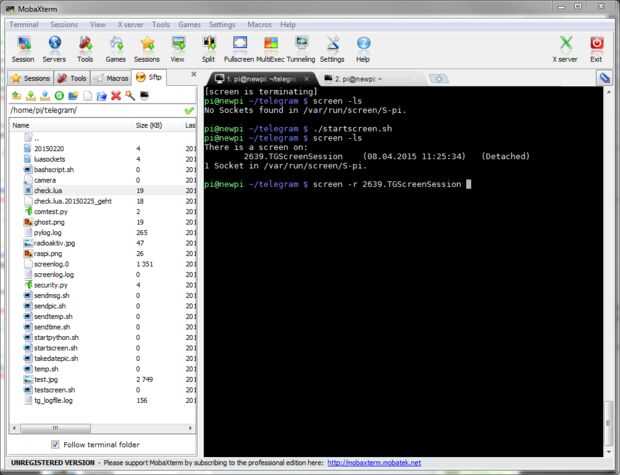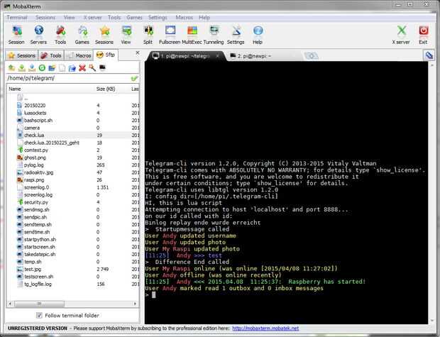 Esto es donde "la pantalla" viene muy bien! Si empezamos al cliente telegrama en una nueva sesión de la pantalla, ¡ tenemos una consola con un nombre! Y entonces podemos decir tarea programada: Envíe "msg mensaje afluente" a la pantalla con el nombre telegramsession. Y esto funciona como en una consola, si la tarea programada se registrarán.