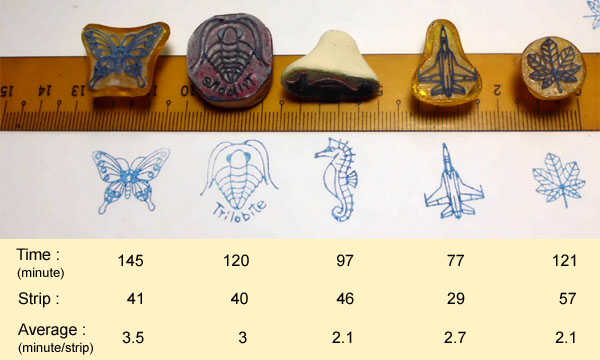 Me tardé 102 minutos a completar este patrón de gato (solo paso 3), contiene 39 tiras, cada tira necesidad 2,6 minutos para cortar, ajustar y pegar. Por supuesto algún patrón podría ser más fácil hacer que otros, trato de algunos diseños más diversos, obtener resultado que necesitan de una tira 2.1-3.5 minutos, deseo que esta información podría ayudar a determinar cuánto tiempo puede tomar para hacer su propio sello.