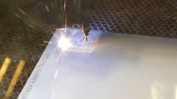 Ahora es el momento de poner la goma en el cortador del laser. Recuerde que debe tener una goma apropiada para láser aunque hay un montón de gomas en el mercado, y son bastantes no destinado a ser quemado y puede ser corrosivo para el cortador del laser y peligroso para usted.