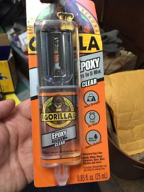 Mezcle aproximadamente la mitad del tubo de epoxy por las instrucciones (más si el área es mayor que el tipo de muestra). Me encanta productos de pegamento del gorila, especialmente desde que el plástico es una celdilla y viene con un palillo de mezcla.