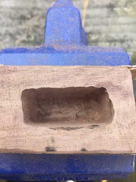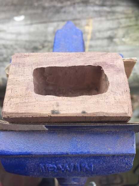 Usando una herramienta giratoria con los accesorios de la broca de corte, corte los agujeros que has puesto en el bloque hasta que se despejó el espacio para el tipo. Si se utiliza un madera blanda, ir lento, como la broca más fácil puede sacar pedazos grandes de madera. Nivel de uso el tipo para determinarla se encajan y aproximadamente. Usted puede limpiar hacia fuera con un cuchillo de bolsillo de pequeño cincel.