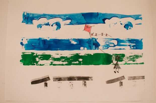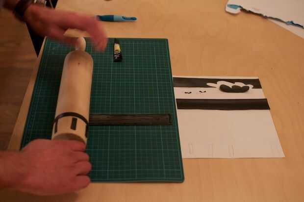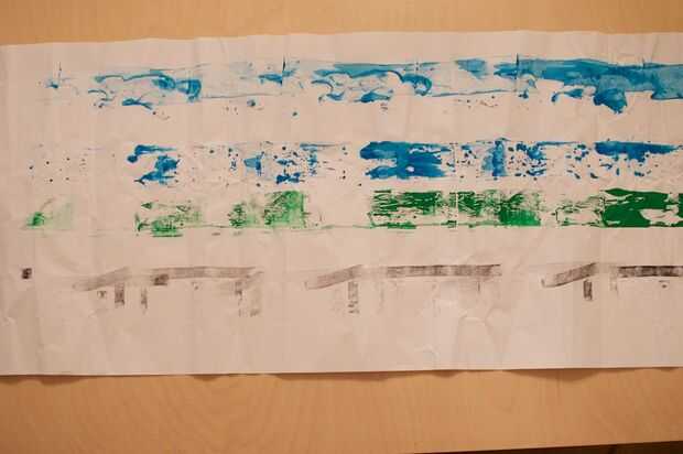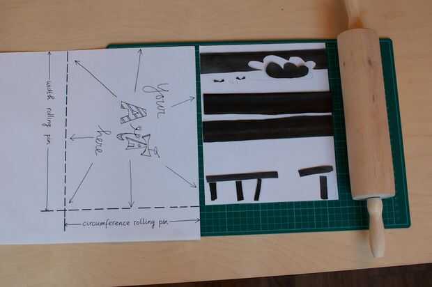 La diversión parte de curso es hacer un patrón o dibujo que se puede "rodar hacia fuera". Por simplicidad, hizo un paisaje y dibujó a una niña con una cometa en él con la mano.