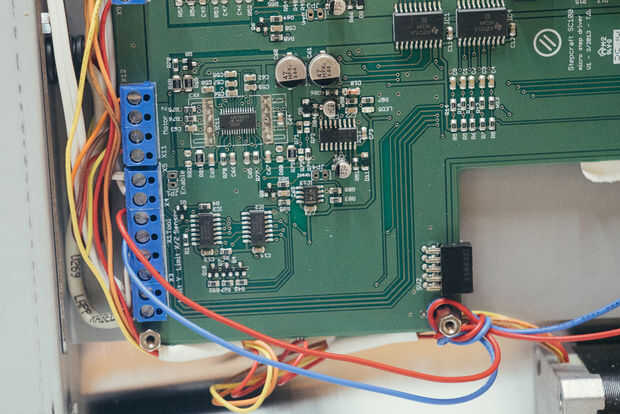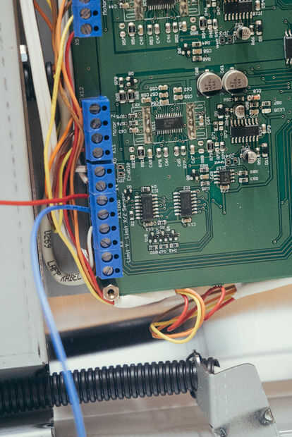 Si has construido tu máquina ya, debe voltear a su lado para acceder al panel de fondo. Retírelo y conecte los cables del sensor a los dos agujeros vacíos en el bloque de terminales de tornillo. Las posiciones se observan en el circuito y en el manual de montaje. También deben ser sólo dos los vacíos. Aquí no importa la polaridad. Corrí los cables el espacio en el panel de gato, atar alrededor de uno de los separadores para el alivio de tensión.