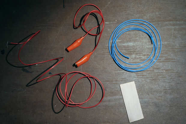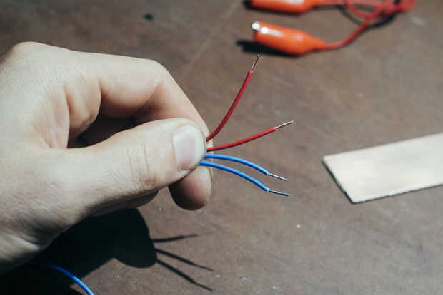 Pele los extremos de los cables, les de la lata y soldar el extremo de uno para el desecho de pcb. El otro cable debe tener dos extremos pelados, uno para la tarjeta controladora, el otro para la pinza.