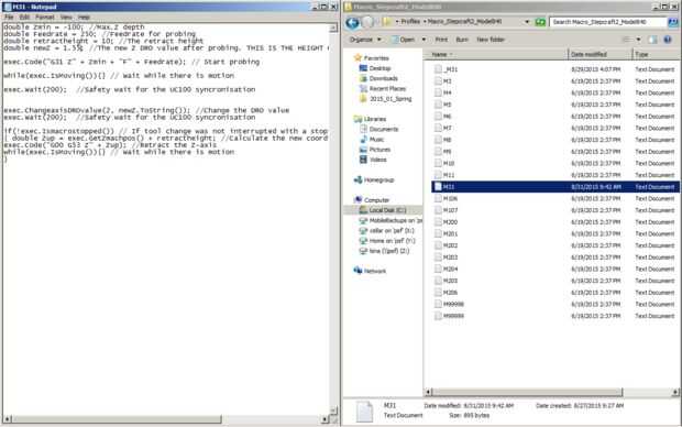 -A continuación vamos a cambiar Macro 31 y programa en el espesor de la placa de toque. Una Macro es sólo un script de control para hacer un movimiento o acción previamente programada. Macro 31 se activa cuando presiona el botón táctil de la interfaz de control. Es un archivo de texto llamado M31.txt ubicado en UCCNC/perfiles/Macro_Stepcraft2_ * yourModelNumber * /. Buscar y reemplazar con el archivo adjunto aquí. Probablemente sería guardar al antiguo uno en otro lugar, por si acaso. Medir el espesor de su sensor, mina fue de 1,55 mm. Abra M31.txt en un editor de texto y entrada de ese valor (en milímetros) para el * newZ * variable donde dice "** el de espesor su SENSOR va aquí! **". Guarde el archivo y reiniciar UCCNC.