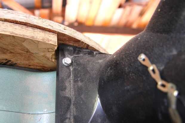 Para el disco superior, encontré algunos trozos de 5/8" OSB. Una vez más decidí laminado de dos piezas juntas para mayor grosor y resistencia. Al igual que el disco de fondo, utilicé una broca dado para formar un surco que cabría en la parte superior del anillo central. Los desechos de los que tenía eran apenas lo suficientemente grandes como para cubrir el anillo, y como veis en la foto, apenas tuvo espacio para la ranura. Luego midió la entrada de la caja del ventilador y cortar un agujero en el centro que encajaría perfectamente. Me di cuenta de que la salida de cuadrado en la caja del ventilador era evitando que estar completamente, así que muesca en la parte superior del disco. Lo probado para asegurarse de que era un buen ajuste al ras y luego utiliza algún pegamento de construcción a attatch el disco superior de la caja del ventilador, creando un sello hermético.