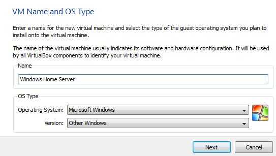 La nueva máquina virtual "Windows Home Server" el nombre y seleccione el sistema operativo Microsoft Windows y otras ventanas. Haga clic en siguiente