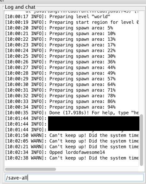 Ya que tienes el servidor en su computadora, usted está en control. Se puede tratar la consola como como introducir trucos en el chat en el juego. Algo que recomiendo es escribir "/op (su nombre de usuario)" en la consola. Esto le permitirá tener la misma potencia que la consola en el juego. Usted será capaz de usar comandos a nadie sin volver a la consola. Puedes op otras personas, y para deshacer esto puede escribir "/ deop (nombre)". Cuando haya terminado, asegúrese de que escribir /save-all en el juego o la consola antes de salir a salvar el mundo.