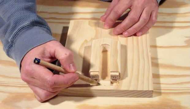 Me mide 3/8" los bordes donde el va y describen una línea para localizar las mortajas (para que 1/4" para el roundover más 1/8" inserción de la espiga). Entonces encontré el centro de la base a lo largo de esta línea y marcado 3/8" fuera el punto central en cualquier dirección. Esto me dio dos puntos a lo largo de esta línea de 3/4" aparte (ya que 3/8 es la mitad de 3/4"). Esta es la medida entre las piernas de los montantes.